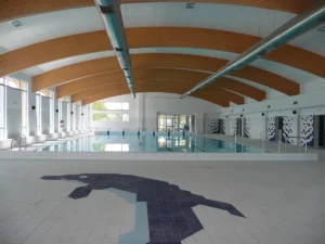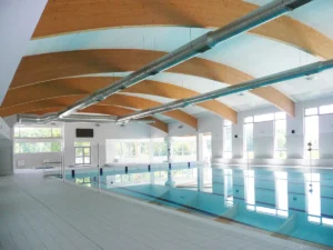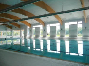 Hala basenowa wymaga stabilnego mikroklimatu, dlatego układ wentylacji i osuszania zaprojektowano pod stałą kontrolę wilgotności i widoczności szyb (bez zaparowań). Materiały wykończeniowe w strefach mokrych są odporne chemicznie, a detale dylatacyjne i cokołowe – łatwe do czyszczenia. Akustykę poprawiono przez zastosowanie pochłaniaczy w newralgicznych miejscach, dzięki czemu hałas nie „niesie” się po całej kubaturze. To rozwiązania, które architekci uznają za kluczowe w obiektach basenowych, bo bezpośrednio wpływają na komfort zajęć i eksploatację.