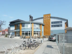 salę konferencyjną na 28 osób – dobry komplet dla grup sportowych, szkół czy organizatorów wydarzeń lokalnych. Architekci zadbali, by te strefy działały niezależnie w różnych godzinach, bez kolizji z halą basenową.