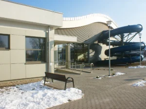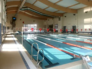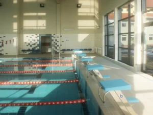 - Basen sportowy 25 × 12,5 m, głębokość 1,30–1,80 m – ergonomiczny układ torów do zajęć szkolnych i pływania rekreacyjnego.