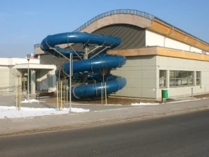 - Zjeżdżalnia z niecką hamowną – atrakcja, która ożywia strefę rekreacyjną bez zakłócania torów sportowych.