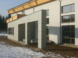 Łącznik umożliwia wejście z budynku szkoły bez wychodzenia na zewnątrz. Ruch grupowy jest rozdzielony od wejścia publicznego, a harmonogram daje pierwszeństwo zajęciom edukacyjnym w godzinach porannych. Takie rozwiązanie porządkuje przepływy i skraca czas przebierania grup.