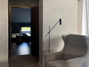 Podstawą jest dębowe drewno o ciepłym odcieniu, kamień o stonowanym rysunku oraz szkło w drzwiach i witrynach. Kolor ścian to neutralne biele i beże, które budują tło. W kilku miejscach wprowadziliśmy ciemniejsze akcenty: grafitowe ramy, detale z czarnego metalu i punktowe tkaniny. Architekci stosują takie kontrasty, aby nadać wnętrzu głębię bez przeładowania.