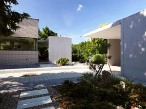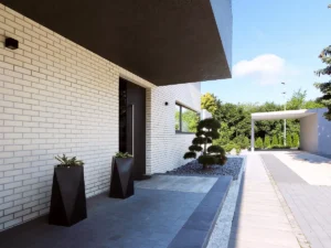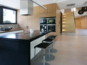 Elewacje wykończono naturalnym kamieniem – trawertynem – oraz drewnem. Ten duet daje spokojny rysunek i dobrze starzeje się w polskich warunkach. Wnętrza utrzymano w prostych podziałach: gładkie zabudowy, logiczne strefy przechowywania, łatwe w utrzymaniu posadzki. Detale są oszczędne: frezowane uchwyty, czytelne cokoły, przejrzyste listwy oświetleniowe. Dzięki temu dom nie wymaga intensywnej pielęgnacji, a ewentualne zmiany wyposażenia nie burzą całości – to świadomy wybór, który architekci proponują inwestorom nastawionym na długoletnie użytkowanie.