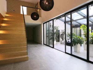 Założono trzy warstwy oświetlenia: ogólne, robocze i nastrojowe. Duże przeszklenia doświetlają strefę dzienną, a ogród zimowy działa jak bufor termiczny. W kuchni i przy blatach zaplanowano światło zadaniowe, które nie męczy wzroku. Układ instalacji zoptymalizowano pod ogrzewanie o stabilnym działaniu i łatwy serwis. To pragmatyczne podejście, które architekci stosują, gdy celem jest spokojna eksploatacja bez niespodzianek.