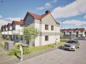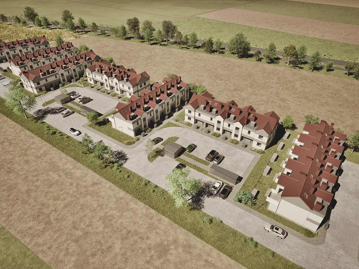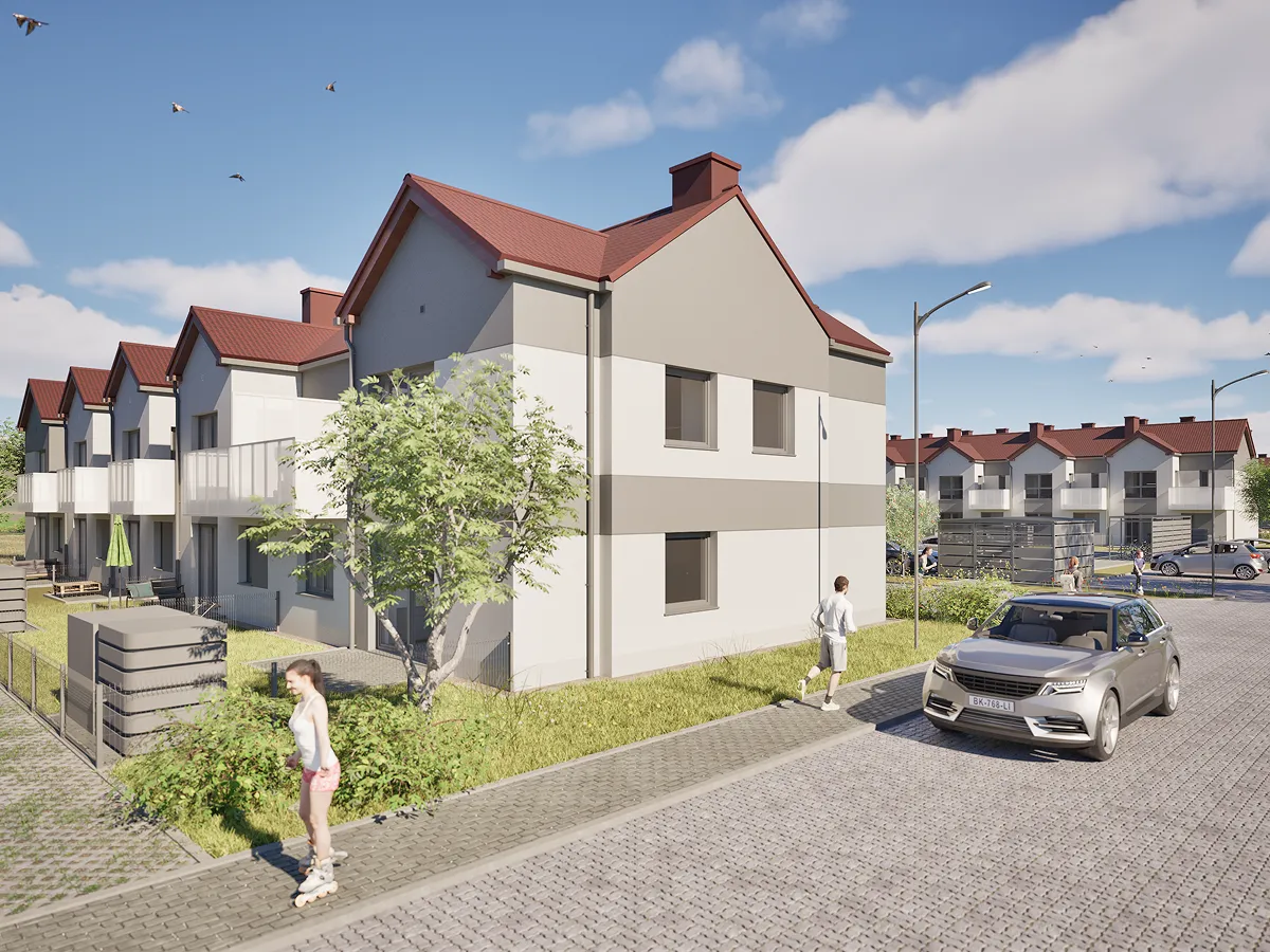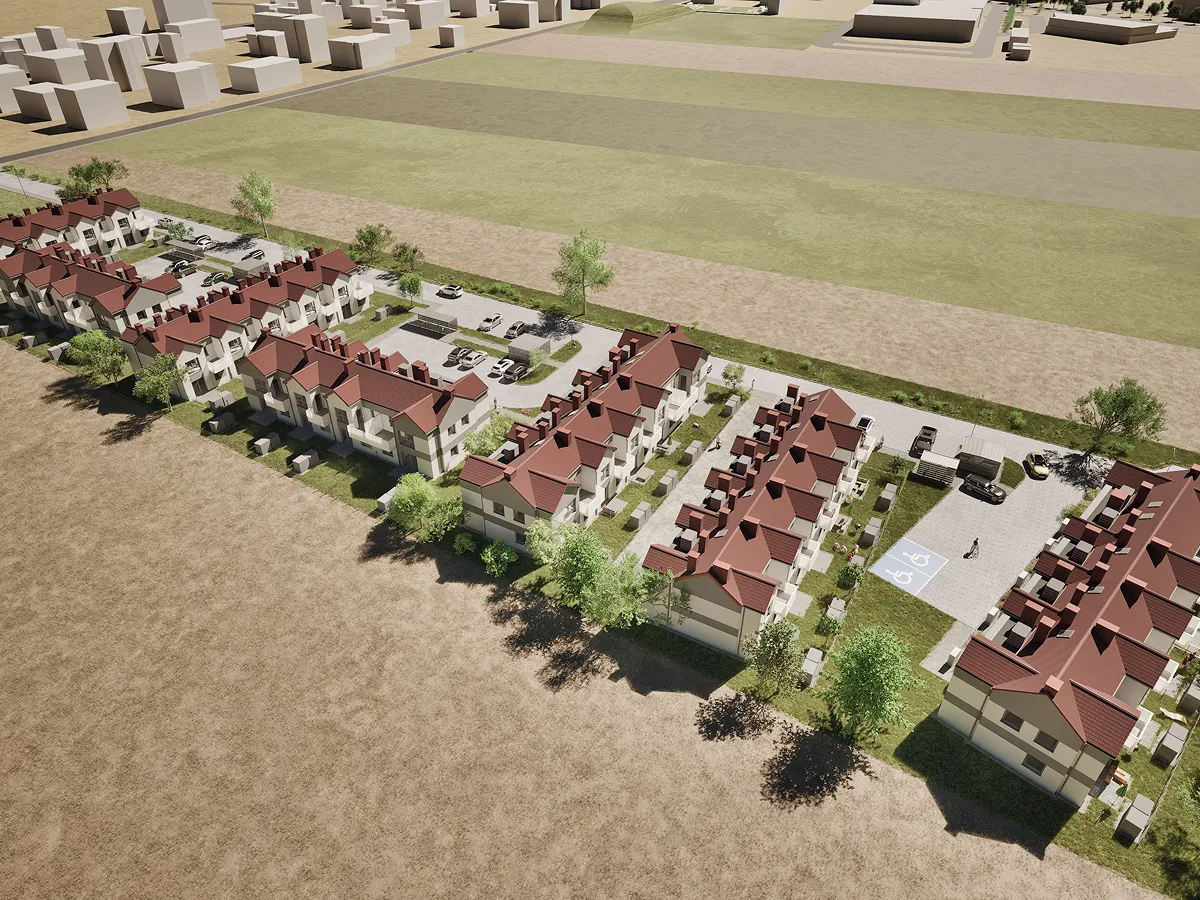 Zaprojektowaliśmy zespół nowoczesnych domów w zabudowie szeregowej, który łączy prosty układ funkcji z przewidywalną eksploatacją. Powstało 33 budynki dwulokalowe (razem 66 mieszkań), pogrupowane w 7 rzędów. Każdy budynek ma dwie kondygnacje nadziemne oraz poddasze nieużytkowe. Każdy lokal posiada niezależne wejście, a lokale parterowe mają własne ogródki. To rozwiązania, które architekci lubią za czytelność, prywatność i mniejsze kolizje w codziennym życiu mieszkańców.