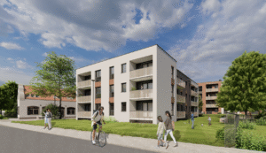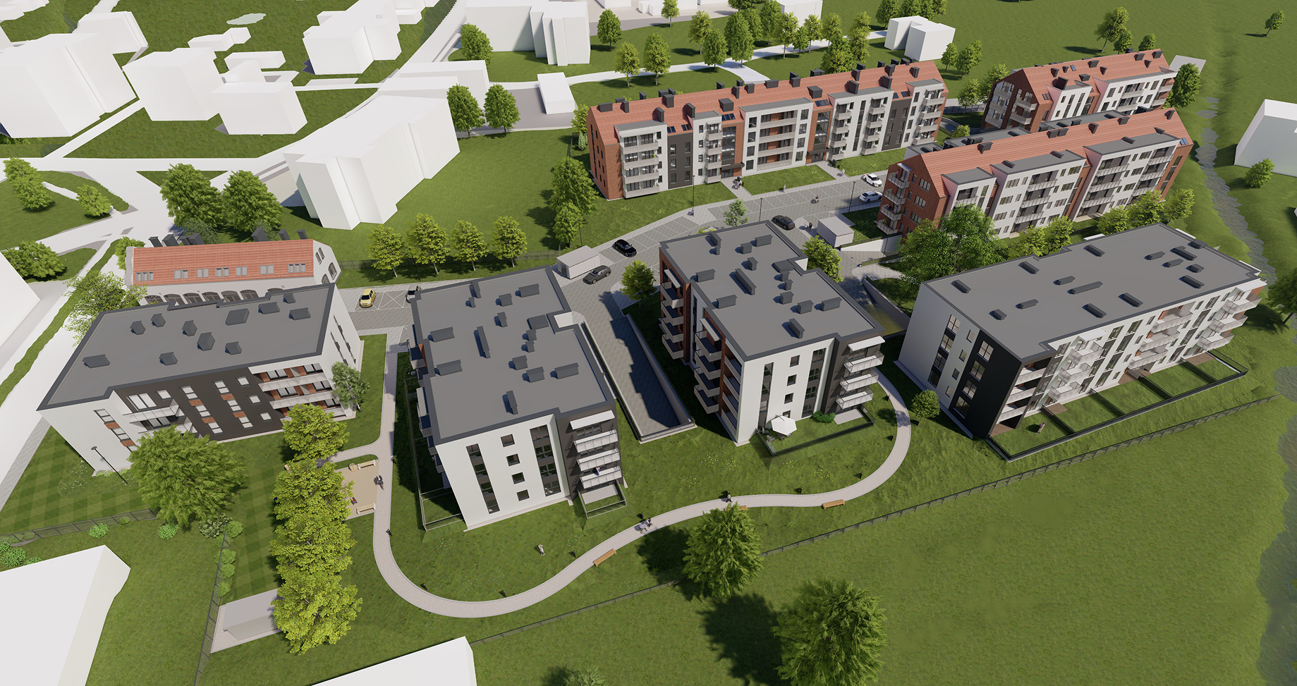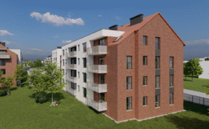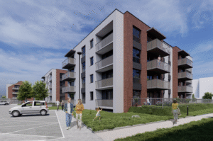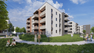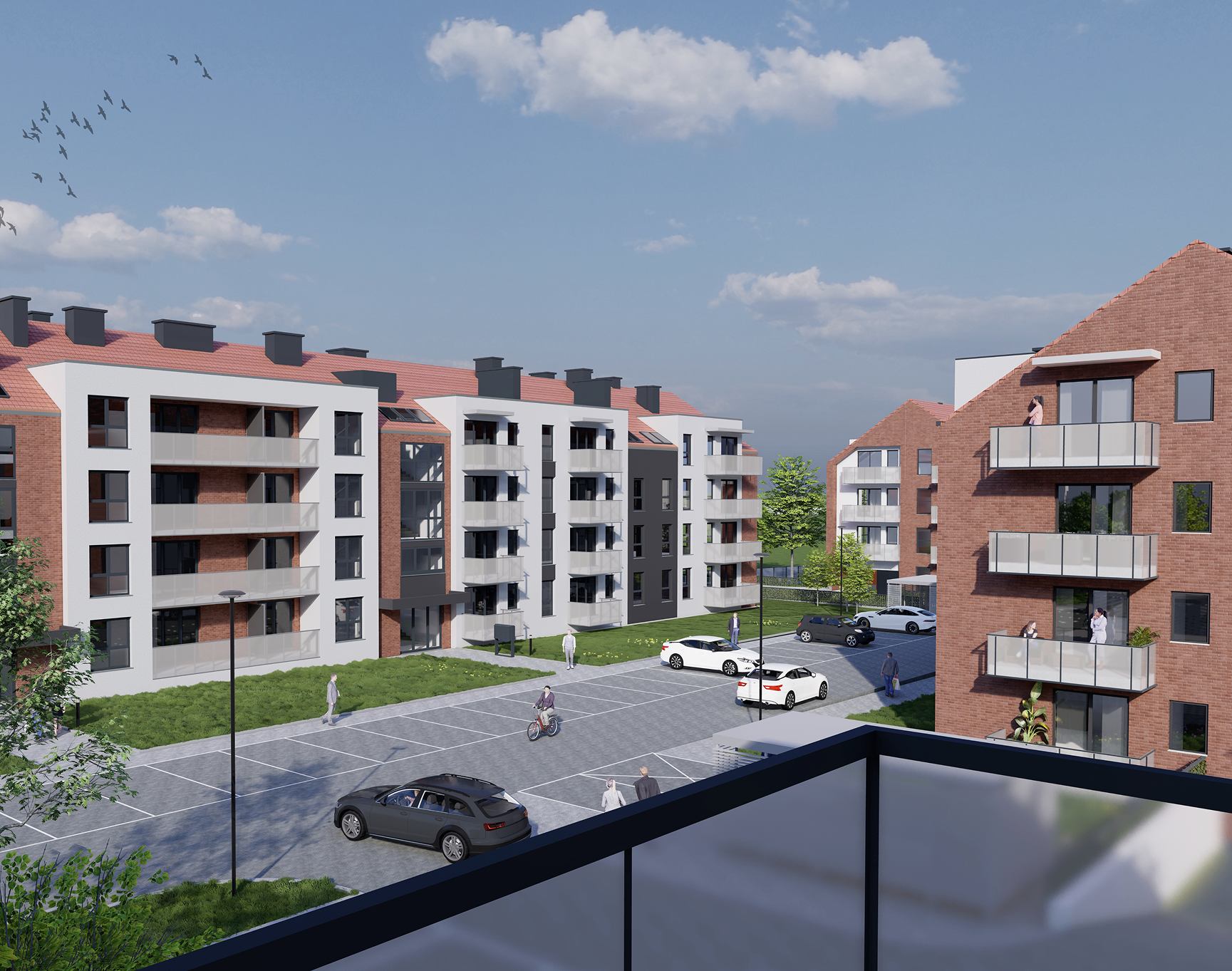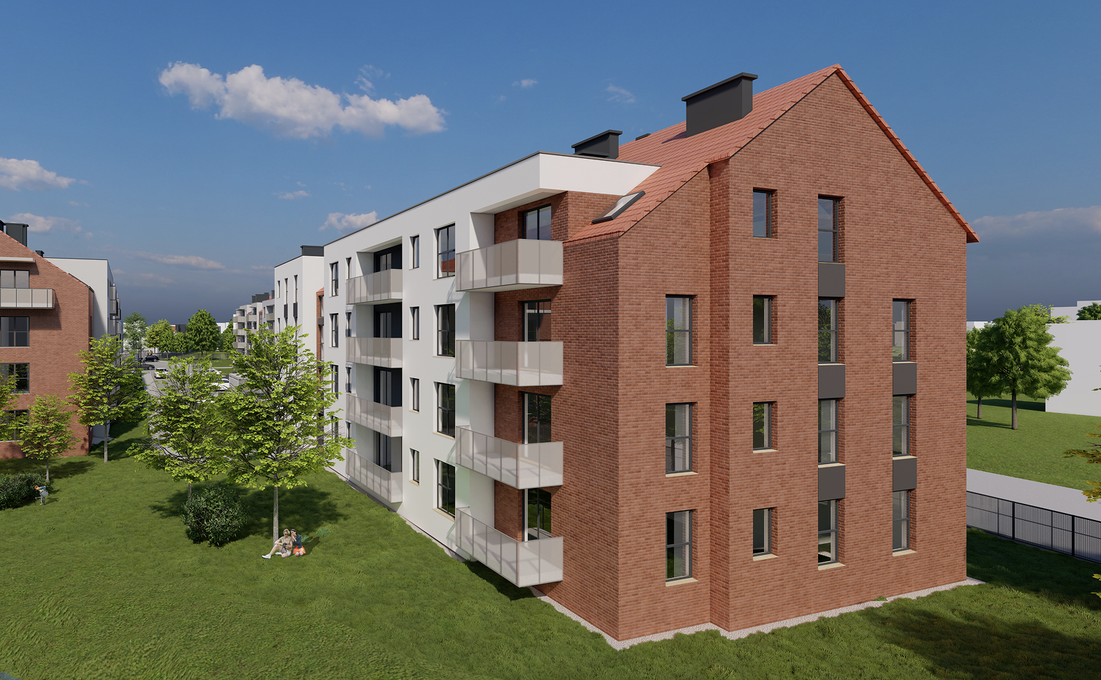 korytarzowe, co daje elastyczny miks planów mieszkań, bez mnożenia nietypowych rozwiązań. Wysokości i gabaryty mieszczą się w zakresie lokalnych linii zabudowy; bryły są zwarte, z rytmicznym rysunkiem okien i balkonów, tak by łatwo było je utrzymywać i czytelnie adresować.