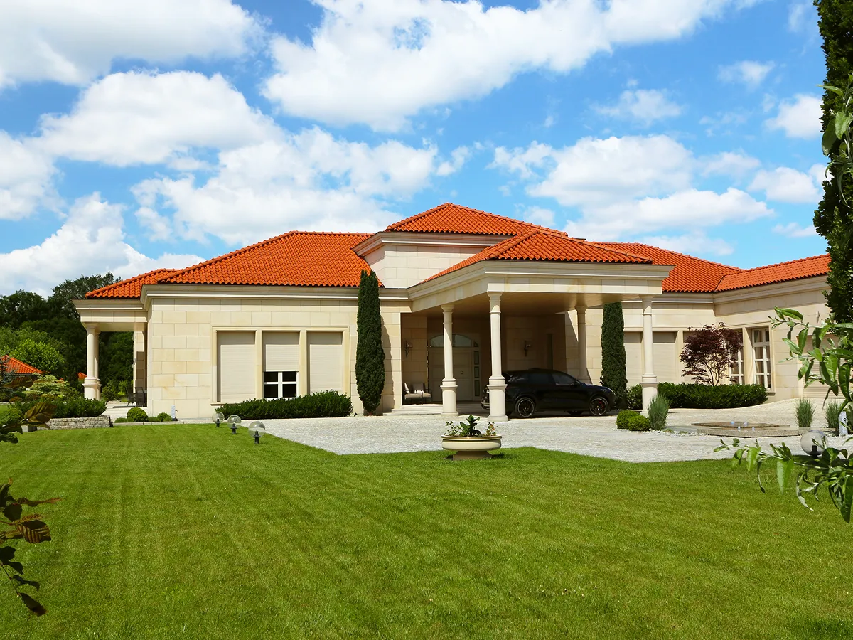 Projekt opracowano w 2009 roku, a budynek oddano do użytkowania w 2012 roku. Powierzchnia działki: 7 897,00 m². Kubatura budynku mieszkalnego: 10 383,05 m³. Powierzchnia zabudowy: 1 488,79 m². Powierzchnia użytkowa: 1 002,77 m². To duża, rozczłonkowana rezydencja, zaprojektowana jako parterowy dom atrialny z poddaszem nieużytkowym, częściowo podpiwniczony. Rozwiązania przestrzenne i techniczne dobrano tak, by dom działał przewidywalnie na co dzień, a układ był czytelny dla użytkowników i wykonawców. Całość przygotowali architekci z myślą o trwałości i spokojnej estetyce, bez przegadania formy.