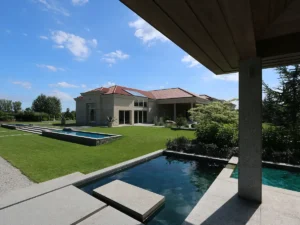 Wnętrza i strefy przy patio oparto na naturalnych materiałach: drewnie, kamieniu i szkle. Drewno ociepla większe przestrzenie, kamień stabilizuje odbiór światła i pracuje jako trwała posadzka, szkło porządkuje widoki i wzmacnia relację z ogrodem. Detale zaprojektowano prosto: rytmiczne podziały stolarki, powtarzalne szerokości okładzin, oszczędne oprawy oświetleniowe. Dzięki temu dom zachowuje spójność, a ewentualne zmiany wyposażenia nie burzą całości — dokładnie na taki efekt celują architekci przy inwestycjach długoterminowych.
